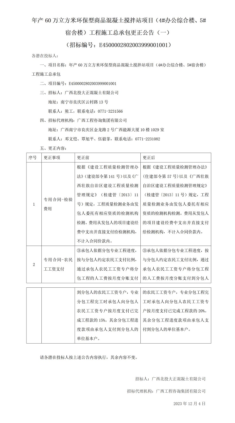 年產60萬立方米環保型商品混凝土攪拌站項目(4#辦公綜合樓、5#宿舍樓)工程施工總承包更正公告(一) (招標編號:E4500002802003999001001