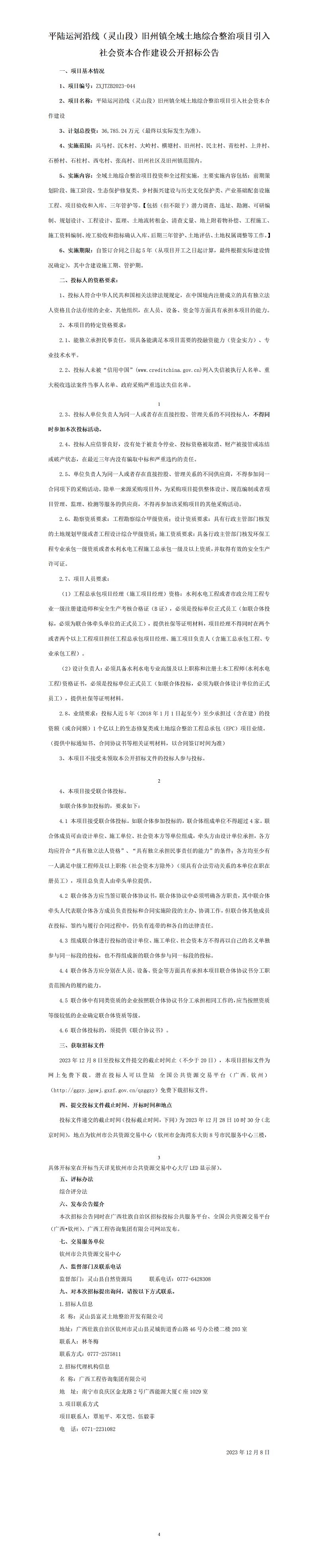 平陸運河沿線(靈山段)舊州鎮(zhèn)全域土地綜合整治項目引入社會資本合作建設公開招標公告